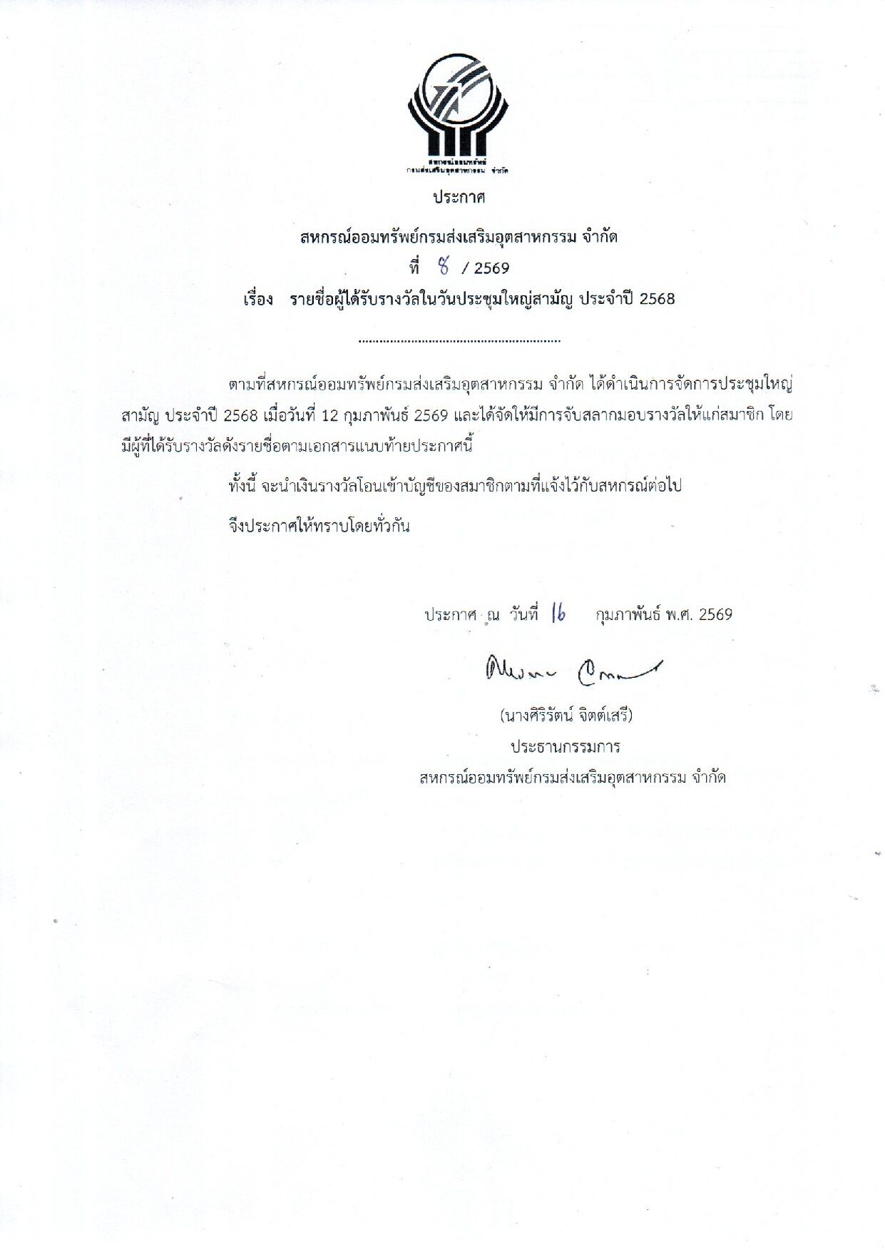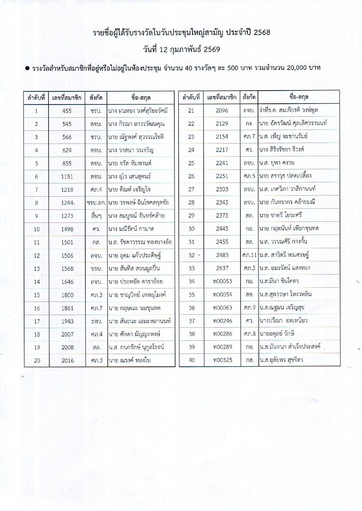ปชส.รายชื่อผู้ได้รับรางวัลในวันประชุมใหญ่สามัญ ประจำปี 2568