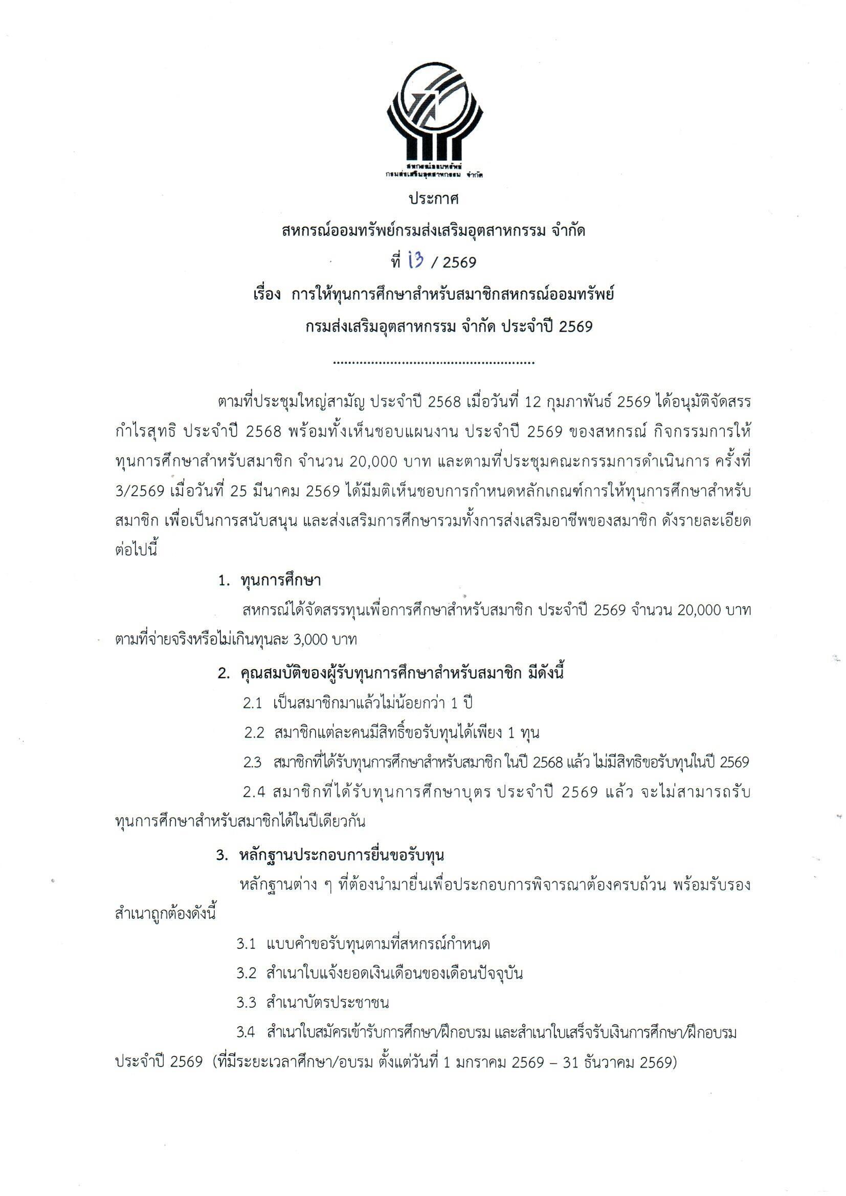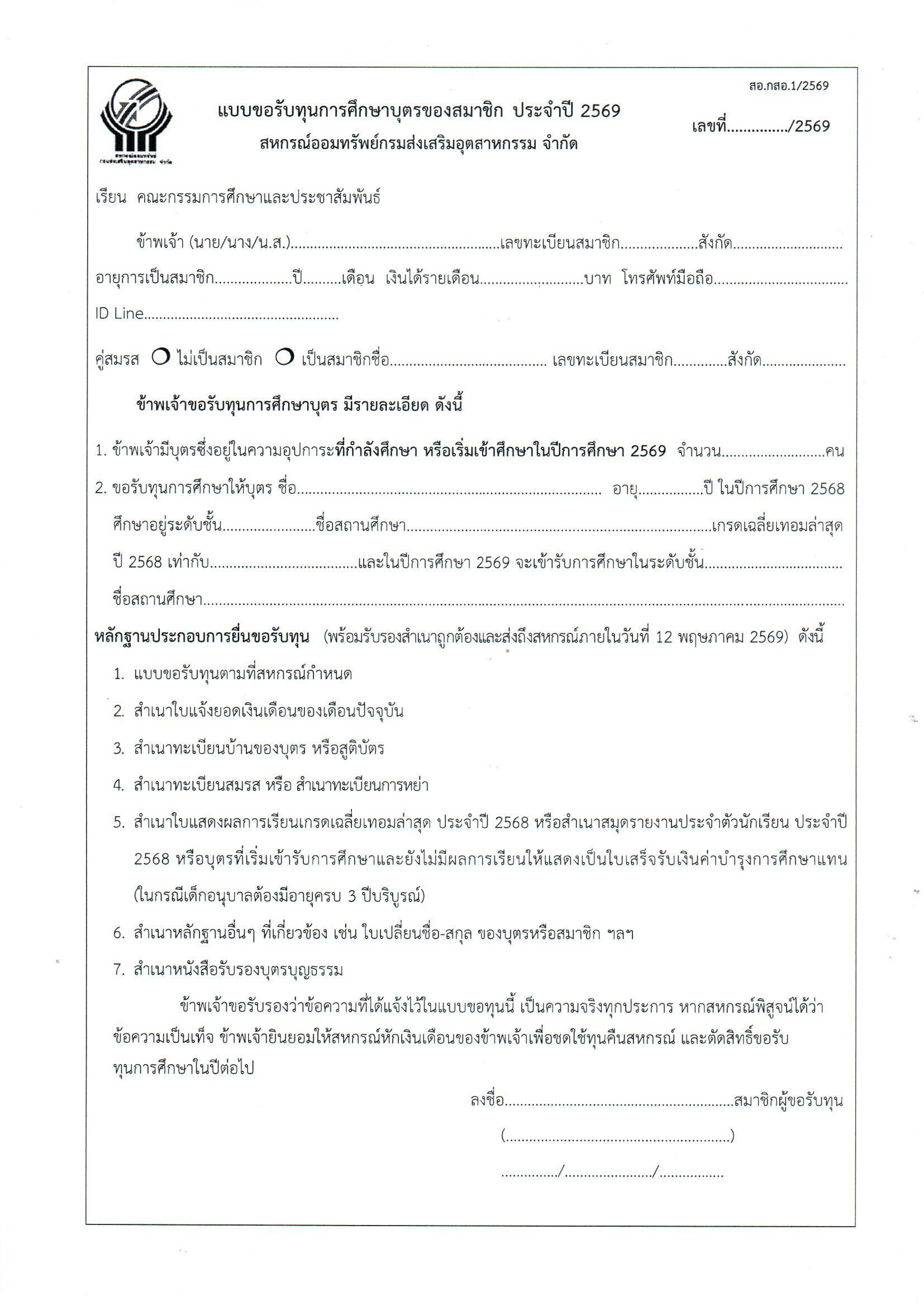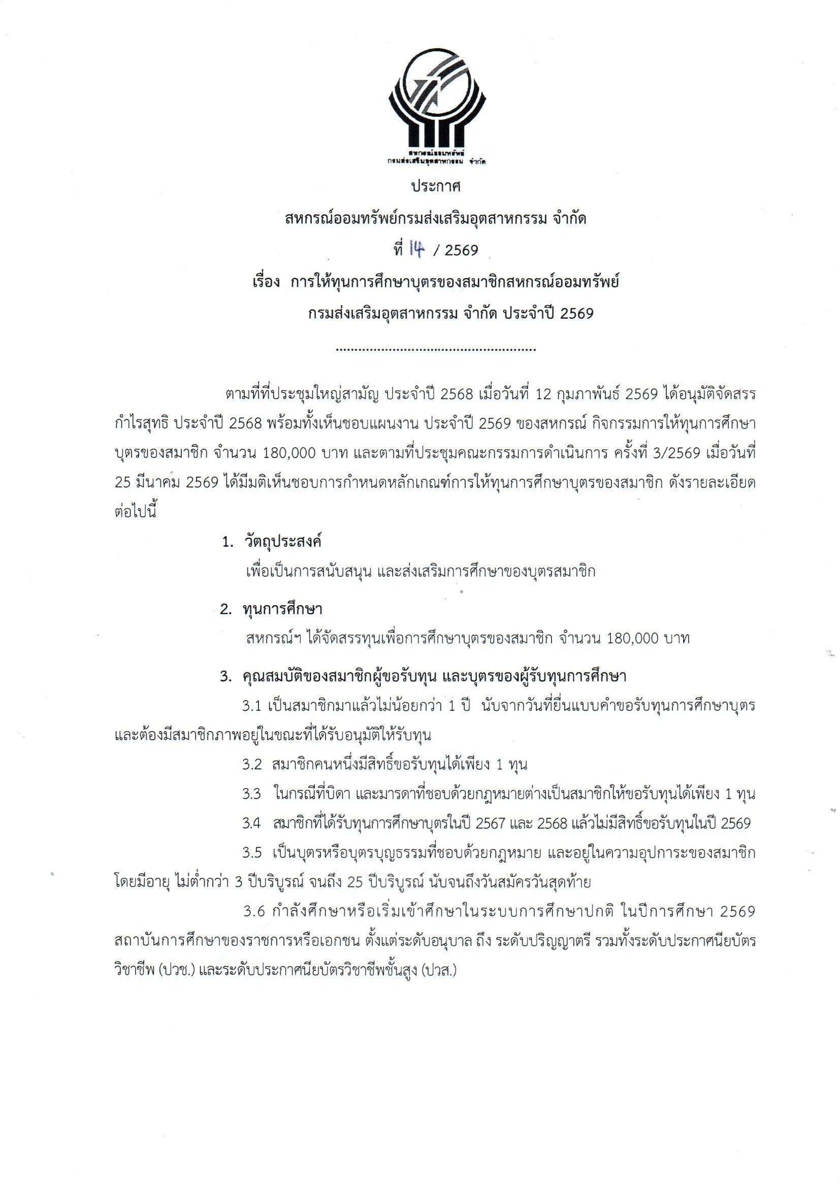ประชาสัมพันธ์ประกาศการให้ทุนการศึกษาสำหรับสมาชิกสหกรณ์ และทุนการศึกษาบุตรของสมาชิกสหกรณ์ ประจำปี 2569
